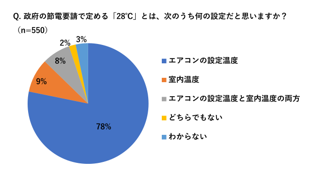 この28℃をエアコンの「設定温度」と混同されている方が多いですが、あくまでも28℃は室温の話です。「政府の節電要請で定める“28℃”とは次のうち何の設定だと思いますか?」という質問では、正しく回答できたのはわずか9%のみという結果になりました。