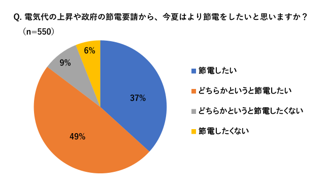 さらに、電気代の上昇や節電要請から、今夏はより節電を意識したいかをたずねたところ、 86%が「節電したい」「どちらかというと節電したい」と回答し、高い節電意向が明らかになりました。