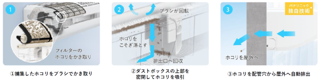 『エオリア』に搭載された“フィルターお掃除ロボット”は、累積24時間以上運転すると、 自動で掃除を始めるという機能を持っています。フィルターが自ら動き、びっしりと配置されたブラシでクリーニングすることで、フィルターのホコリをしっかりとかき取り、キレイに取り除いてくれます。さらに、自動で捕集したホコリをブラシでかき取り、ダストボックスに入れ、配管穴から屋外へ自動で排出してくれる※ため、ホコリに直接触れることなく、 フィルター掃除を完了させることができます。