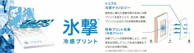 フリーズテックの特徴は、布地にあります。とは言っても、布地自体ではありません。その布地に冷感剤を印刷するプリント技術がすごいのです。冷感剤はいろいろあります。有名なのは、ガムに入れるキシリトール。噛むと口内がすっとするやつです。その成分を、プリントするわけです。水分、つまり発汗するとその中の水分がプリントされた冷感剤と反応。布地の温度を下げます。そして50回洗濯しても、ほとんど剥がれ落ちることはありません。効果が持続するわけです。