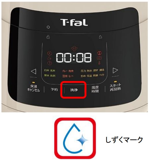 「スチーム洗浄」をするときは内鍋に炊飯カップ1杯分の水を入れて「洗浄」ボタンを押すと、しずくマークが点灯します。約10分の自動運転後、蒸気を排出します。においが気になるときは、炊飯カップ2杯分の水とレモン1個(8等分のくし切り)を入れて「洗浄」ボタンを押すと、におい除去洗浄ができます。 終了後は鍋の水を捨てて軽く水洗いしてください。