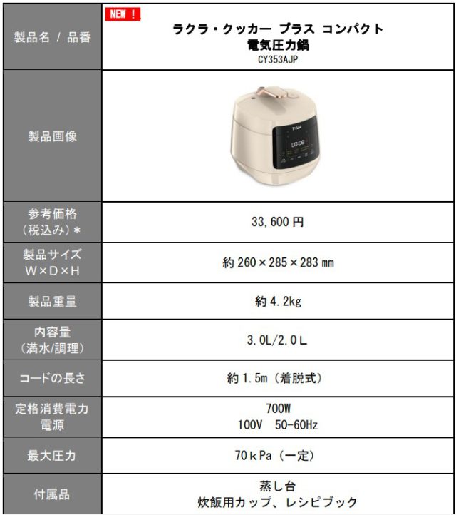 (株)グループセブ ジャパンの所有ブランド「ティファール」から、電気圧力鍋「ラクラ・クッカー プラス コンパクト電気圧力鍋」が、2022年9月、参考価格メーカーや卸売業者など小売業者以外の者が、小売業者に対して示している価格。再販売価格(問屋,小売店,消費者への販売価格)を拘束するものではない。:33,600円(税込)で、リニューアル発売されます。