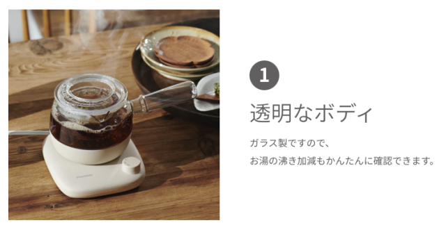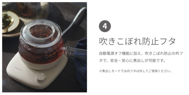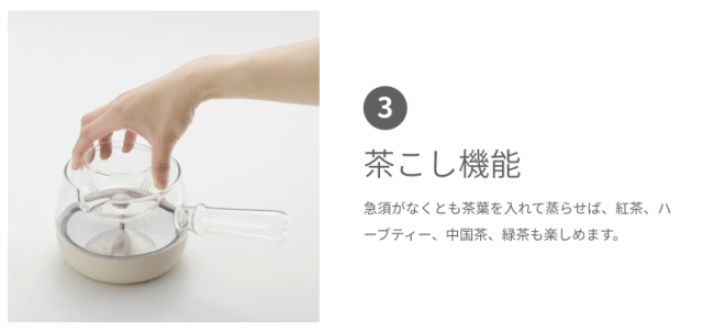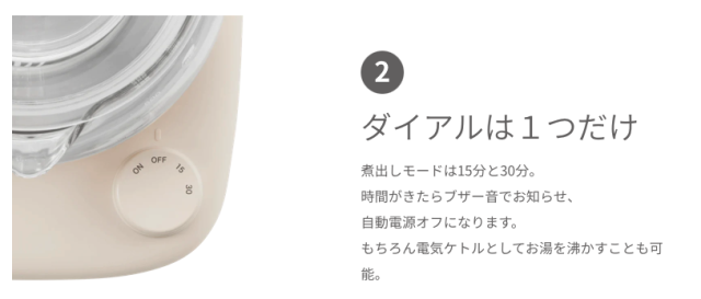 湯沸かしはもちろん、緑茶や紅茶などの茶葉の蒸らし、さらに15分/30分のタイマー機能で薬草茶や漢方茶を手軽に煮出すことができる、お茶に特化した1台3役の新しい電気ケトルです。