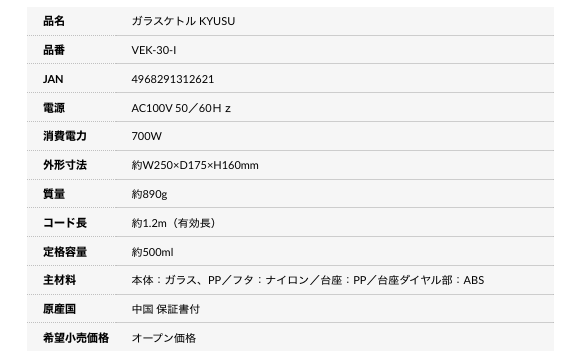 #調理家電 #キッチン家電 #ゼリックコーポレーション #Vitantonio #ビタントニオ #電気ケトル #ガラスケトル #KYUSU #キュウス #VEK-30-I #生活家電.com