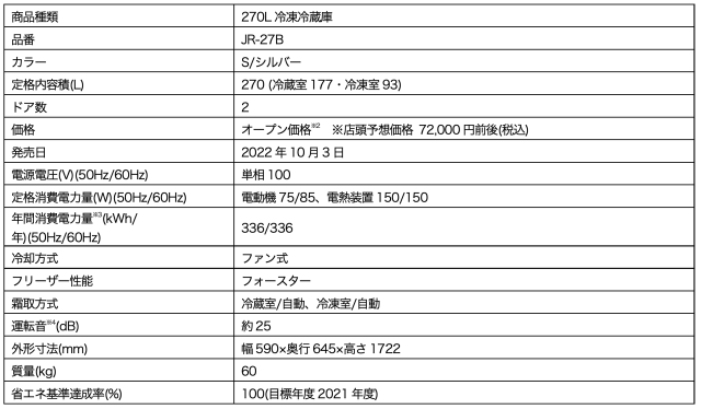 ハイアールジャパンセールス(株)から、新しい生活様式への変化に伴い、 ニーズが高まり続けている大容量冷凍室を備えた、326L冷凍冷蔵庫(JR-NF326B)、262L冷凍冷蔵庫(JR-NF262B)、270L冷凍冷蔵庫(JR-27B)が、2022年10月3日より全国の家電量販店、ホームセンター、GMS、WEB通販などで順次発売されます。
