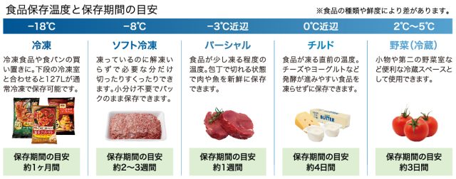 326L冷凍冷蔵庫、262L冷凍冷蔵庫は、-20℃~5℃まで1℃単位で温度調節が可能な「セレクトゾーン」を搭載。利用シーンに合わせて「冷凍(-18℃)」「ソフト冷凍(-8℃)」「パーシャル(-3℃近辺)」「チルド(0℃近辺)」「冷蔵(2~5℃)」などの温度帯に設定が可能です。