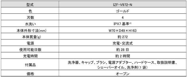 今回発売する「IZF-V972-N」はハイエンドシリーズの特長である、本体も刃も3年保証電源アダプターなどの付属品および交換用替刃は除く。保証規定により有料修理となる場合があります。、約4週間続く電池持ちフル充電し1日1回3分使用の場合。ヒゲの濃さ、 肌にあてる力、周囲の温度などにより、使用日数は異なります。はそのままに、洗浄、乾燥、充電を自動で制御し、刃を99%除菌●試験依頼先:一般財団法人 日本食品分析センター、●試験成績書発行番号:第18080928001-0101号、第18080928002-0101号、●試験結果:99%以上の除菌効果、●試験方法:洗浄器にて専用洗浄剤を使用し洗浄・乾燥した刃部の一般細菌数(生菌数)を測定(すべての菌に効果があるわけではありません)できる洗浄器を付属しています。また本体は丸洗いしてお手入れできるIPX7基準IPX7基準(水深1mに30分浸けても本体に有害な影響を生じる水の浸入がない)検査をクリアしています。にも対応しています。開発・製造は、グループ会社であるマクセルイズミ(株)の長野県松本市にある本社工場で行っています。