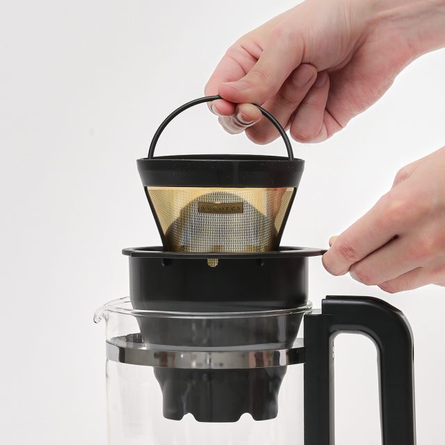 コーヒーが美味しく淹れられるコレスこだわりのゴールドフィルターを使用。同梱のティーサーバーをセットすると、お茶もいれられる。