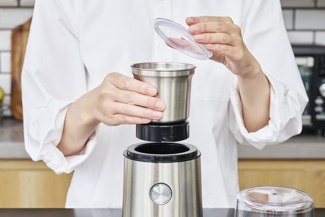 グラインディングボウルは取り外し可能。挽いた豆の飛び散りを防ぐ蓋つき。残った粉も、付属の蓋を使えばそのまま保存できます。