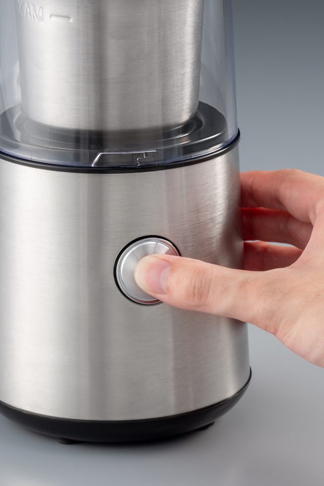 スイッチだけのシンプル構造。ボタンを押している間回転するため、好みの挽き具合を見ながら調整できます。