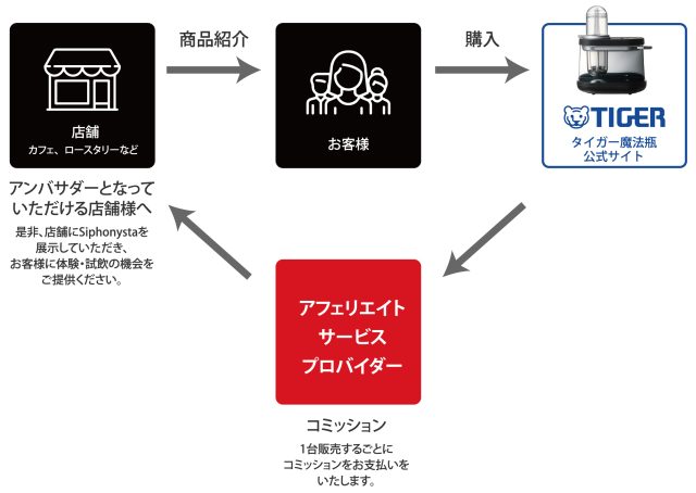 アンバサダーとなっていただける、コーヒーのプロ(ロースタリー、コーヒー店やカフェなどの店舗が対象)を募集し、店舗内にて「Siphonysta」を紹介していただき、お客様がタイガー魔法瓶公式サイトでご購入いただくと、店舗様にコミッションをお支払いする新しいビジネスモデルです。