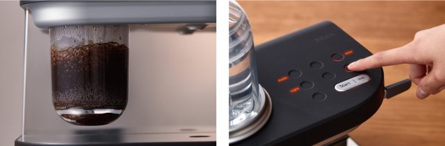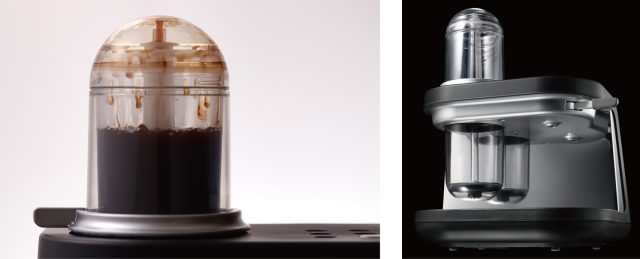 抽出されたコーヒーがまるで噴水のように噴きあがる美しい抽出過程を演出する透明シリンダーを採用。上部シリンダーの空気を抜くことで、上下シリンダーに圧力差を発生させ、コーヒーのろ過と抽出を行います。またシリンダーとパイプの距離は、噴きあがるコーヒーが最も美しく見える距離に調整、魅せる抽出過程にこだわりました。