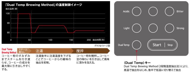 抽出過程で温度を切り替えてコーヒー豆の本来の風味を引き出す、 Dual Temp(2段階温度抽出)機能のモードを搭載。 雑味を押さえ、よりコーヒー豆の風味を楽しんでいただける抽出方法となり、従来の抽出方法では実現しえなかった濃厚で革新的な味わいを実現します。