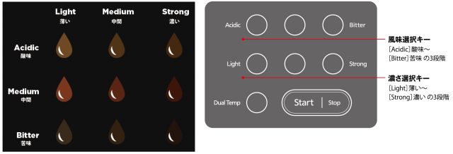 ●同じ豆で9通りの味が楽しめる 風味3段階×濃さ3段階 調整メニュー