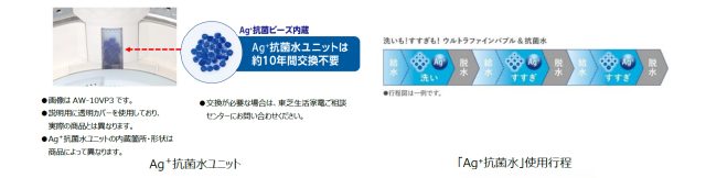 Ag+抗菌水ユニットに水道水が通過することで銀イオンが溶け出し、水道水が抗菌成分を含んだ「Ag+抗菌水」に変化します。「ウルトラファインバブル」と共に繊維の奥に入り込み、洗濯のたびに衣類を抗菌します。Ag+抗菌水ユニットは洗濯機に内蔵されており、約10年間交換が不要です。