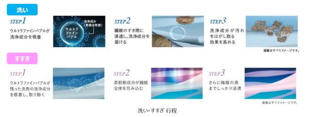 直径1マイクロメートル未満の目に見えないナノサイズの泡「ウルトラファインバブル」が洗浄効果と柔軟剤の効果(注3)(注4)を高めます。洗いの行程で、直径1マイクロメートル未満の目に見えないナノサイズの泡「ウルトラファインバブル」が洗浄成分(界面活性剤)を繊維の奥まで運び、皮脂汚れをしっかり落とすことで黄ばみを予防します。さらに、臭いの原因となるたんぱく質汚れをすっきり洗い落とすことで汗などのイヤな臭いを防ぎます(注5)。すすぎの行程では「ウルトラファインバブル」が繊維に残った洗浄成分を吸着して取り除くため、すすぎの効果が高まり、柔軟剤成分が繊維の奥までしっかり浸透します。すすぎの回数や水量を増やすことなく、しっかりすすぎ、仕上がりの柔らかさと香りの効果が高まります。