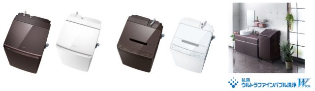 東芝ライフスタイル(株)から、目に見えない泡で黄ばみを防ぐ「抗菌ウルトラファインバブル洗浄W」と、液体洗剤・柔軟剤自動投入を搭載した、タテ型洗濯乾燥機2機種、全自動洗濯機2機種が、6月より発売されます。