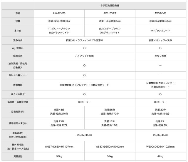AW-12VP3:https://www.toshiba-lifestyle.com/jp/laundries/aw-12vp3/ AW-10VP3:https://www.toshiba-lifestyle.com/jp/laundries/aw-10vp3/ AW-8VM3:https://www.toshiba-lifestyle.com/jp/laundries/aw-8vm3/