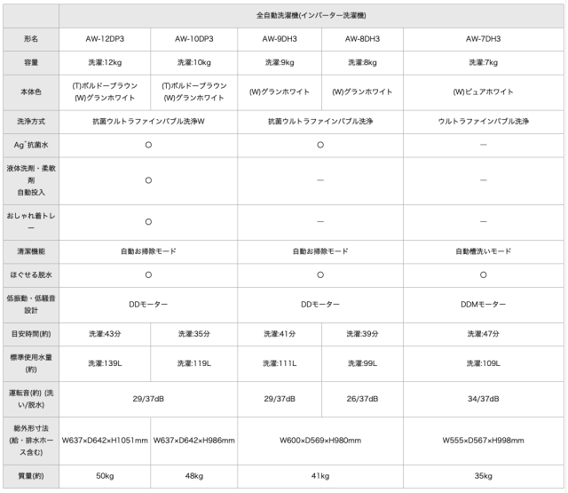 AW-12DP3:https://www.toshiba-lifestyle.com/jp/laundries/aw-12dp3/ AW-10DP3:https://www.toshiba-lifestyle.com/jp/laundries/aw-10dp3/ AW-9DH3、AW-8DH3:https://www.toshiba-lifestyle.com/jp/laundries/aw-9dh3/ AW-7DH3:https://www.toshiba-lifestyle.com/jp/laundries/aw-7dh3/