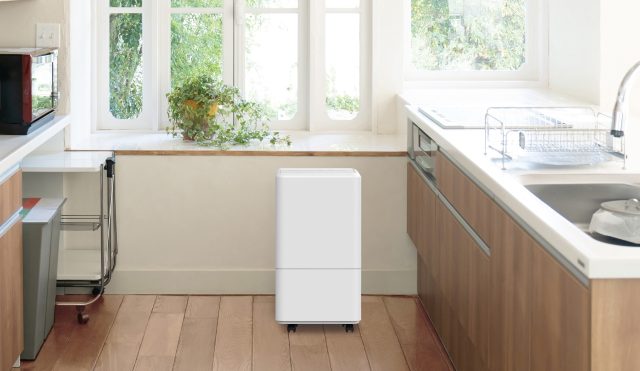 今回発売される「コンパクトクーラー」は、運転時に発生する水を溜めるタンクを本体前面に、排気口を本体上部に配置することで、排気に必要なスペースを壁際から約5cmと小さく抑えることができるため、キッチンや脱衣所など、熱のこもりやすい限られたスペースでも使用できるように設計されています。また、キャスターと取手が付いており移動させるのもスムーズです。