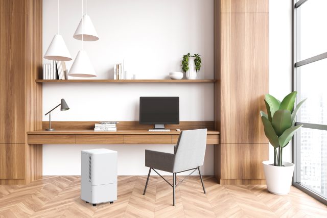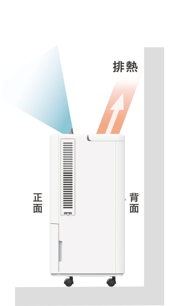 運転時発生する水を溜めるタンクを本体前面に、排気口を本体上部に配置したことで、排気に必要なスペースを壁際から約5cmの空間と小さく抑えることができます。壁際から大きく離す必要がないため、キッチンや脱衣所など、熱のこもりやすい限られたスペースでも使用できます。