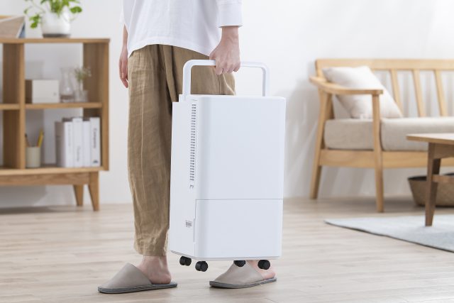 キャスターと取手が付いており、部屋間の移動がスムーズにできます。また、質量は12.5kgと昨年発売したポータブルクーラーと比較して約10kgも軽いため、階段でも移動させることができます。