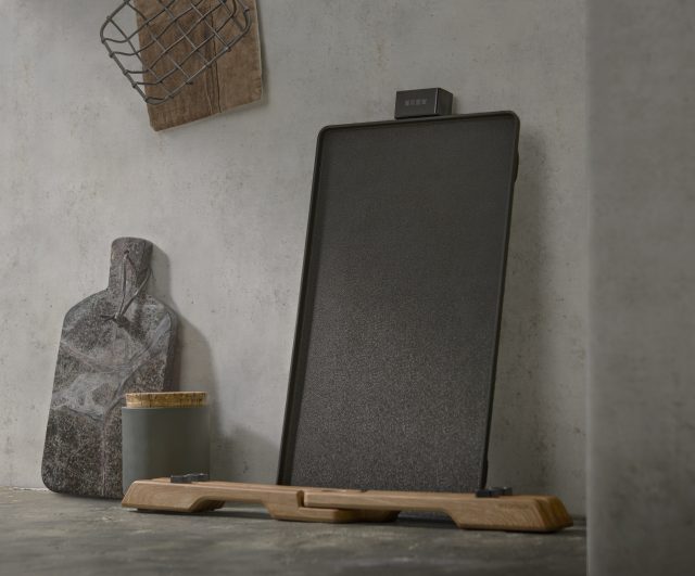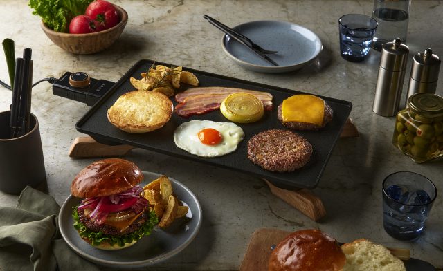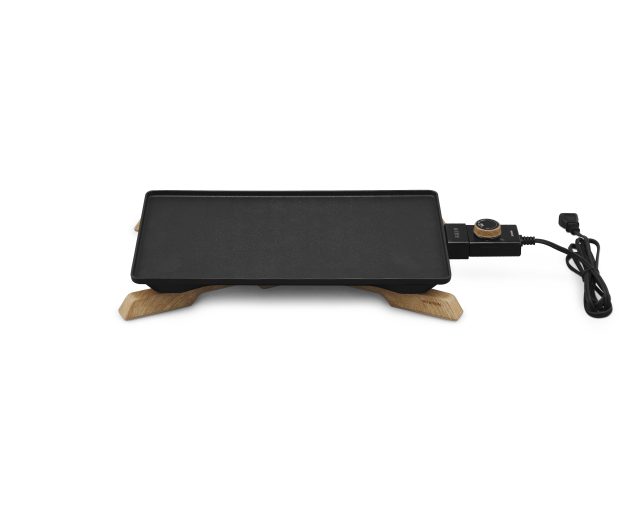プレートは最も薄い部分が10mm、調理面のサイズは幅405mm×奥行245mmと、直径約19cmのお好み焼きが2枚同時に焼ける大きさ。プレートにヒーターを内蔵することで、プレート温度を一定に保ち、肉など食材を均一に高火力で加熱できます。火力は、保温から高温(約80℃~230℃)まで無段階温度調節ができ、ステーキ、チーズフォンデュ、目玉焼きなど、家族との毎日の食事から友人と集まるパーティーまで多彩なシーンで活躍します。
