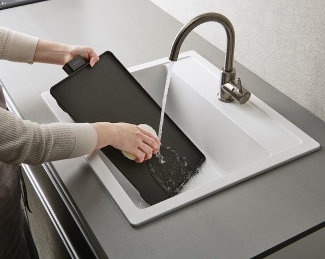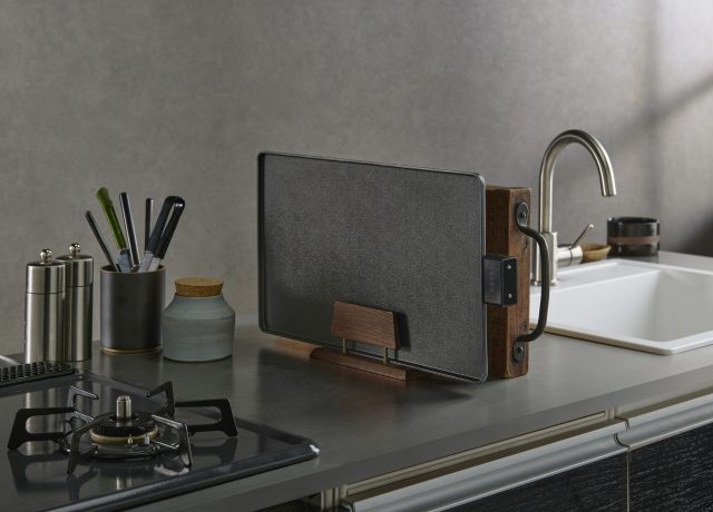 まな板スタンドなどに立てかけられる薄型プレートと折りたためるX型の脚により、狭い場所にも収納できます。ホットプレートの収納場所に困るという利用者の悩みに応えます。