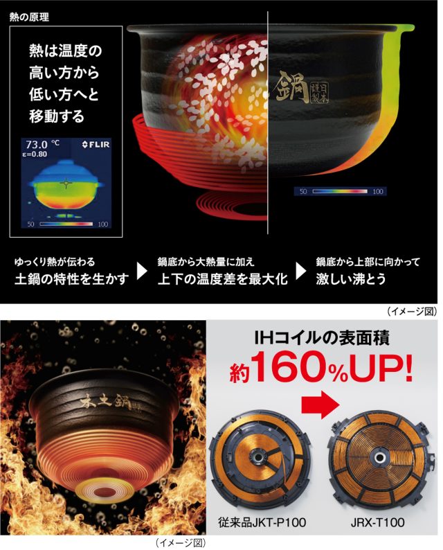 ※1 JRX-T100において「白米」メニュー4合、炊きわけ「しゃっきり」、火かげん「強」炊飯時。内なべ外側底面の温度(当社調べ)。JRX-T060は約250℃