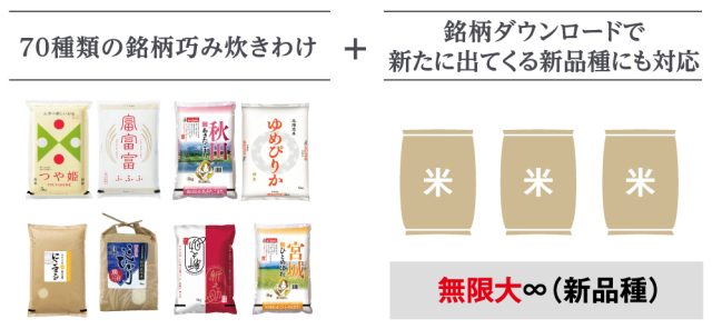 日本には約900種類※もの米が存在し、しかも毎年多くの新ブランドが誕生しています。アプリと連携することで、新たに発売されたブランド米に対応した炊飯プログラムをダウンロードすることが可能です。お米の進化に合わせて、常にアップデートした炊き方ができ、最新の炊き技でごはんを炊きあげることが可能です。