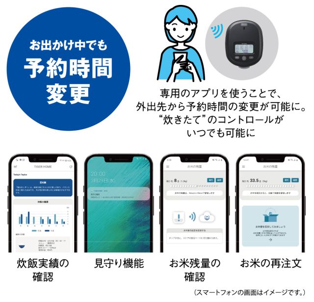 専用の「TIGER HOME」アプリを使うことで、外出先から炊飯予約時間の変更が可能になりました。予定よりも帰宅が早くなった、遅くなった時に炊飯予約時間の変更をすることができます。