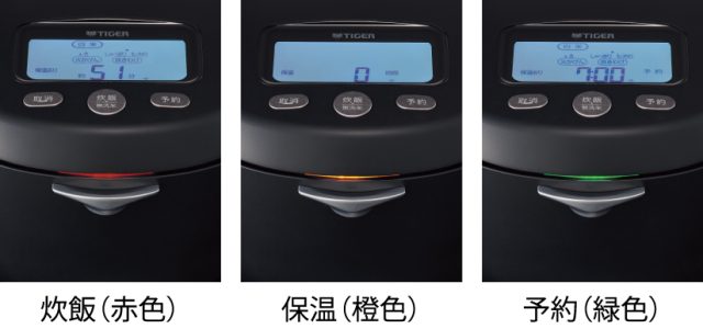 さらに遠くからでもジャー炊飯器の状態がひと目でわかるように、炊飯(赤色)・保温(橙色)・予約(緑色)と状態に合わせて色が変化します。