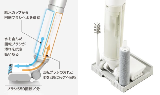 WIPELは、本体の前面に配置した給水カップからヘッドの回転ブラシへ水を供給し、回転ブラシを濡らして汚れを拭き上げる設計です。拭くのと同時に汚れた水やブラシについたゴミを強い力で吸い上げて、本体背面のカップへ回収するので、常にきれいな水とブラシで掃除をすることができます。
