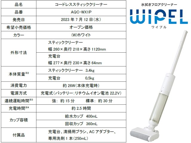 アクア(株)から、同社初、床の水拭きとゴミやほこりの吸引が一度にでき、コンパクト設計で取り回しやすい水拭きフロアクリーナー「WIPEL(ワイプル)」(AQC-WX1P)が、2023年7月12日に発売されます。