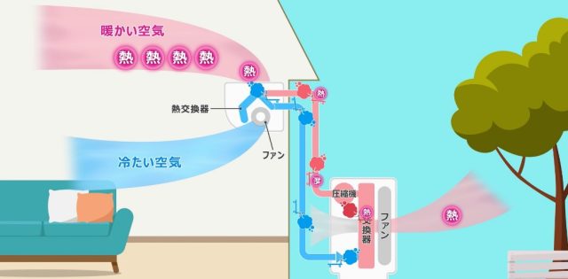 エアコンの室内機と室外機の中には、熱を空気の中から集めたり、空気中に逃がしたりする「熱交換器」と、空気を動かすための「ファン」が入っています。そして、パイプの中には、熱を運ぶ「冷媒(れいばい)」というガスが循環しています。室内機はファンを使って「暖かい」空気を吸い込みます。熱交換器で集めた熱を冷媒が受け取り、外に運び出します。熱が少なくなった「冷たい」空気が部屋の中に戻されます。冷媒が運んだ熱は、室外機のファンが送り出す風に乗って、熱交換器から出ていきます。熱を手放した冷媒は室内機に戻り、また熱を運びます。