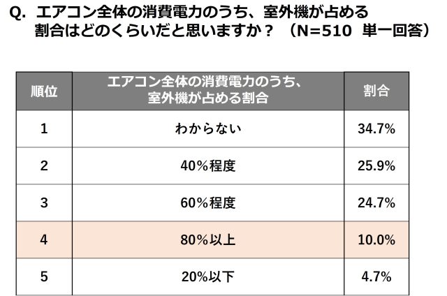 さらに、エアコンが最も電力を使う場所について「エアコン全体の消費電力のうち、室外機が占める割合はどのくらいだと思いますか」という質問をしたところ、正解である「80%以上」と回答した人は1割に留まる結果となりました。