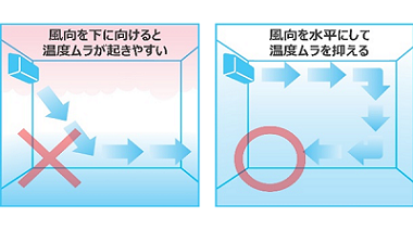 少しでも「温度ムラ」を抑えるには、風向は「下向き」ではなく「水平」にするのがおすすめです。冷たい空気は重いため、床方向にたまる性質があります。最初から床付近に冷気を送り込むのではなく、上から下に冷気が自然に降りるようにすることで、「温度ムラ」 を抑える効果があります。また、エアコンの風が身体に直接あたる不快感を和らげることにもつながります。