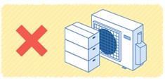 空気の通り道は、室内の「熱」を外に逃がす「室外機」にとっても大切です。室外機周辺に障害物があり、吸込口や吹出口が塞がれてしまうと、熱を効率的に逃がせずエアコンに負荷がかかり、無駄な電力消費につながります。室外機の周辺はすっきりと、余計なものは置かないようにしましょう。