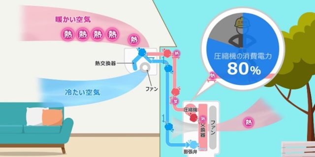 エアコンを動かす電気の大部分は、この「圧縮機」を動かすために使われるのですが、その割合は、なんと約80%。エアコンの消費電力のほとんどは、圧縮機が使っています。