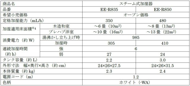 ※5適用床面積の目安 日本電機工業会規格(JEM1426)に基づきプレハブ住宅洋室の場合を最大適用床面積とし、木造和室の場合を最小適用床面積としたもの。■同時発売 スチーム式加湿器(EE-RS型)