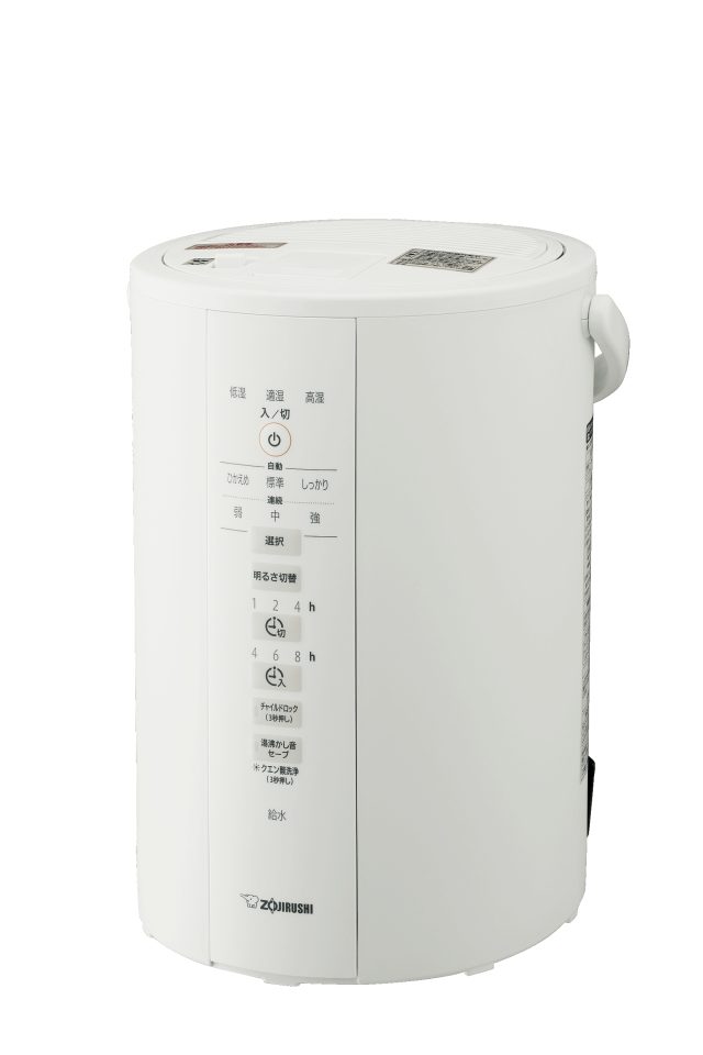 象印のスチーム式加湿器は、フィルター不要であることに加え、広口の容器なので、お手入れがしやすい構造。また、「チャイルドロック」「ふた開閉ロック」「転倒湯もれ防止構造」などの安心設計や、就寝時にも便利な「連続加湿約8時間室温20℃、満水時に連続「強」コースで運転した場合。」という特徴を持ちます。