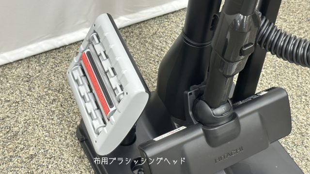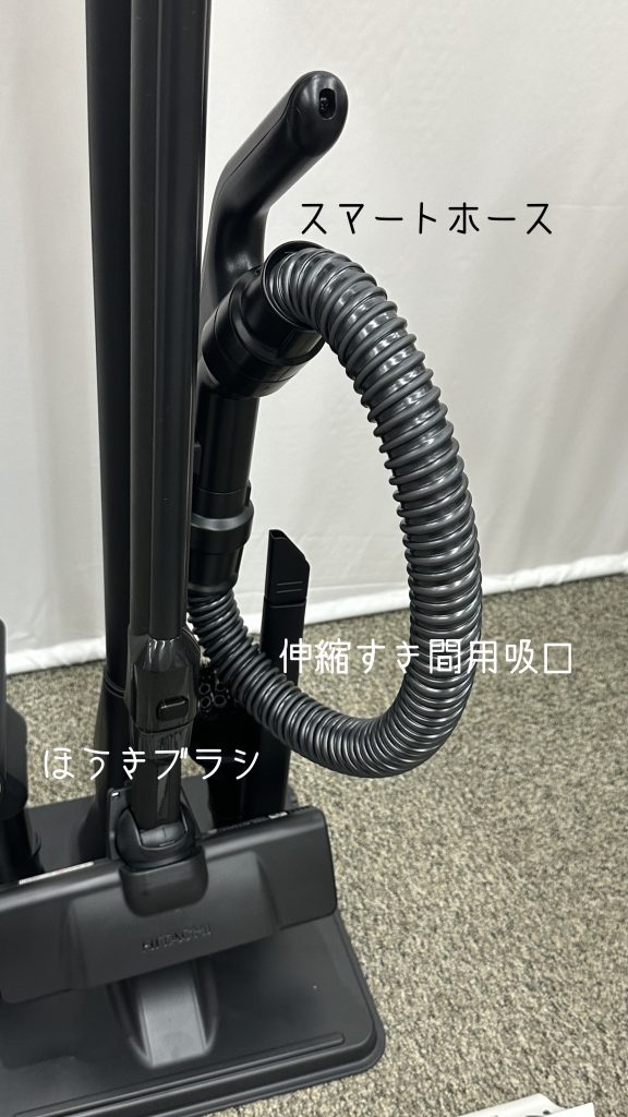 付属のアタッチメントは、「ハンディブラシ」「伸縮すき間用吸口」「布用ブラッシングヘッド」「ほうきブラシ」「スマートホース」の5点。布団には「布用ブラッシングヘッド」を使います。