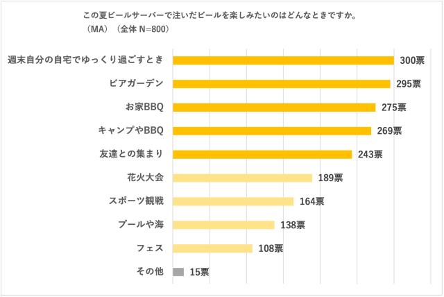 ●今年の夏のビールサーバー活用傾向。外でのシチュエーションでも 今年の夏ビールサーバーはどのようなシチュエーションで使用されているのでしょうか。「この夏ビールサーバーで注いだビールを楽しみたいのはどんなときですか」と全世代に尋ねたところ「週末自宅でゆっくり過ごす時(300票)」が最多で、僅差で「ビアガーデン(295票)」、「お家BBQ(275票)」、「キャンブやBBQ(269票)」と続く結果となりました(図13)。