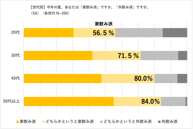 世代別の集計でも、各世代において「家飲み派」が過半数を占め、世代が上がるにつれ、「家飲み派」率が上昇しており、最多の50代以上では8割以上(84.0%)に及んでいます。(図2)。