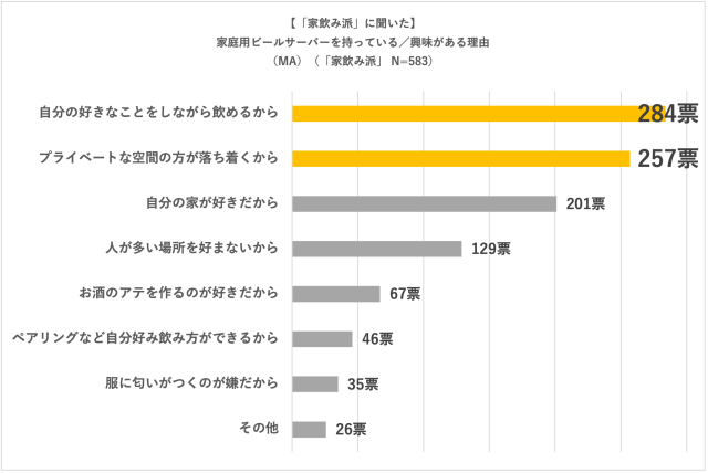 ●家飲みの理由は「自分の好きなことをしながら飲めるから」「プライベートな空間が落ち着くから」 今夏の大勢となった「家飲み派」にその理由を複数回答で尋ねたところ、「自分の好きなことをしながら飲めるから(284票)」が最多の回答で、次いで「プライベートな空間の方が落ち着くから(257票)」、「自分の家が好きだから(201票)」、「人が多い場所を好まないから(129票)」と続きました(図3)。