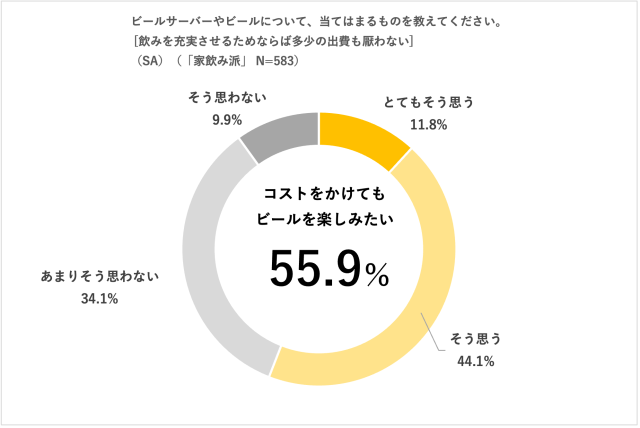 ●家飲み派の中でビールサーバーやビールでの飲みを充実させるために「出費を厭わない」人は半数超え 家飲み派に対してビールサーバーやビールの飲用を充実させるうえでのコストについて尋ねたところ、「出費を厭わない」との回答が過半数となりました。(55.9%)(図4)。