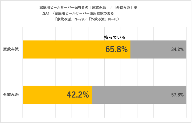 ●「家飲み派」は家庭用ビールサーバー保有率が高い傾向 家庭用ビールサーバーを使用したことがある人のうち、実際にビールサーバーを「持っている人」は、「外飲み派」が 42.2%に対して「家飲み派」が 65.8%と、家庭用ビールサーバーの保有率は「家飲み派」が約1.5倍高い結果となりました(図6)。