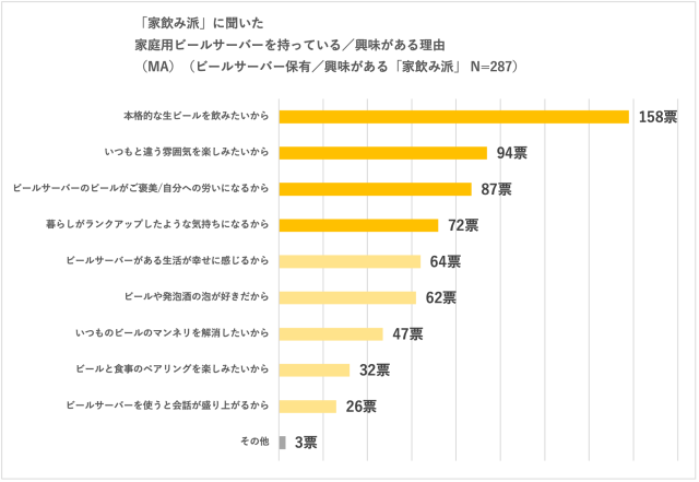 また、「ビールサーバーを持っている」あるいは「興味がある」と回答した家飲み派 287人を対象に、その理由も複数回答で尋ねました。すると、「本格的な生ビールが飲みたいから(158票)」が最多で、2位「いつもと違う雰囲気を楽しみたいから(94票)」と大きな差が開きました。ほかに、多くの表を集めたのは「ビールサーバーのビールがご褒美/自分への労いになるから(87票)」、「暮らしがランクアップしたような気持ちになるから(72票)」となりました(図8)。ビール本来の味わいを引き立てる特長や家で手軽にぜいたくなひと時を演出できる点などを主な理由として、家庭用ビールサーバーが支持されていることが読み取れます。