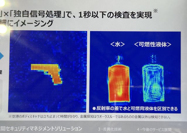 例えばパネル化した場合、その間を通りさえすると、瞬時に銃などの所持品が分かるわけです。人体との差で見分けますので、溶液でも見つけられます。