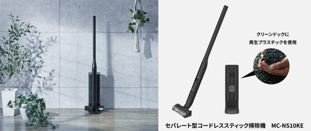 本モデルは2021年発売のセパレート型コードレススティック掃除機MC-NS10Kをベースモデルに、廃棄された家電製品からリサイクルした再生プラスチック材をクリーンドックに使用。再生プラスチック使用率を製品全体の約40%(※1)にまで高めたモデルです。さらに梱包形態も見直し、発泡スチロールの緩衝材を不使用、外装箱の印刷面積・インク使用量を最小限に抑えたエシカルパッケージにするなど、環境に配慮した仕様になっています。